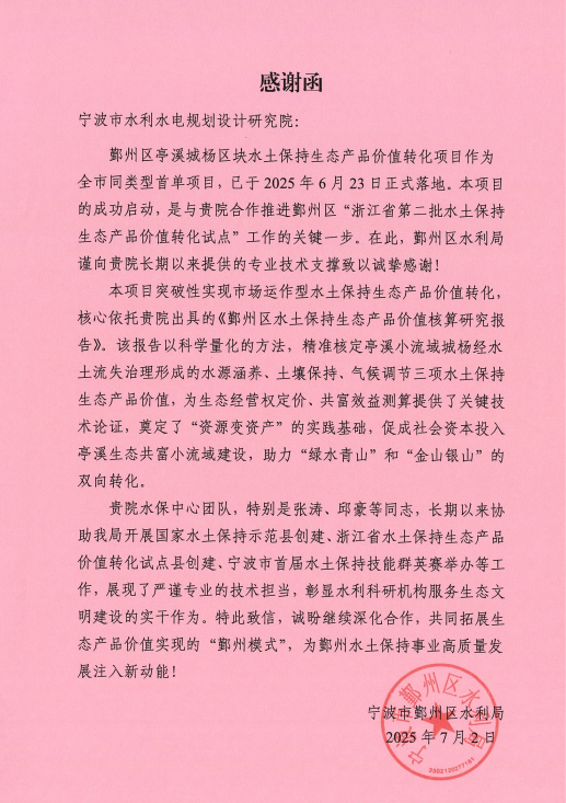 鄞州區(qū)水利局在感謝信中特別指出,我院提供的技術(shù)支持不僅專業(yè)高效,更體現(xiàn)了強烈的責(zé)任意識和服務(wù)意識。信中高度贊揚了水保中心團隊,特別是張濤、邱豪等同志,在相關(guān)工作中展現(xiàn)的嚴(yán)謹(jǐn)務(wù)實的工作作風(fēng)、精益求精的專業(yè)態(tài)度,以及不辭辛勞的奉獻精神。這份肯定不僅是對項目組的褒獎,更是對我院全體職工莫大的鼓舞和激勵。