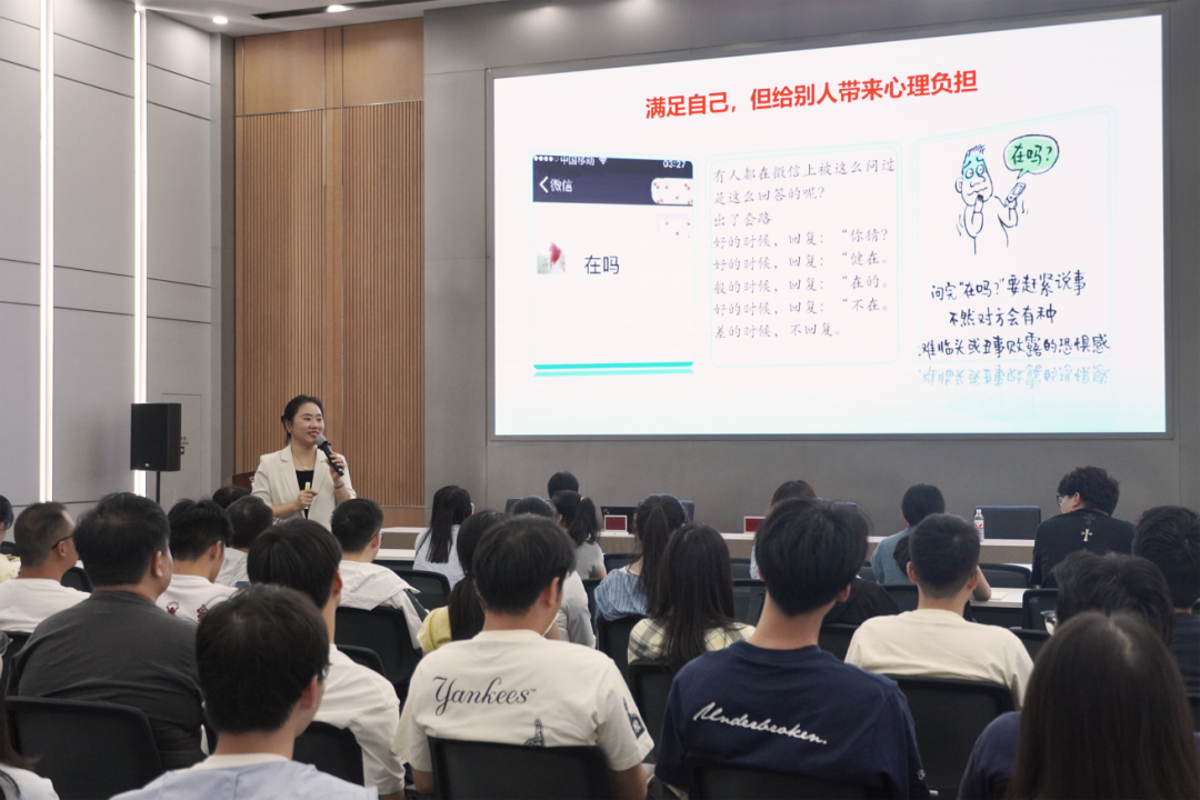 陳瑛老師的講座圍繞自我激勵(lì)、協(xié)同溝通、對(duì)外溝通、對(duì)上溝通四大維度展開(kāi)。首先,陳瑛老師分別以工作場(chǎng)景和生活場(chǎng)景中的溝通對(duì)話與大家進(jìn)行互動(dòng),帶領(lǐng)大家對(duì)“高情商”進(jìn)行思考與剖析,由此展開(kāi)當(dāng)天的主題。隨后,結(jié)合豐富的實(shí)戰(zhàn)案例與互動(dòng)環(huán)節(jié),陳瑛老師層層遞進(jìn),深入淺出地講解了如何在日常工作中實(shí)現(xiàn)高效溝通,激發(fā)自我驅(qū)動(dòng)力,提升團(tuán)隊(duì)協(xié)同效能。在長(zhǎng)達(dá)2.5小時(shí)的課程中,陳瑛老師還結(jié)合商務(wù)禮儀的要點(diǎn),根據(jù)不同場(chǎng)景對(duì)溝通實(shí)操進(jìn)行了解析。并強(qiáng)調(diào),良好的溝通不僅是技巧,更是一種心態(tài)與習(xí)慣的培養(yǎng),也是實(shí)現(xiàn)個(gè)人與團(tuán)隊(duì)實(shí)現(xiàn)共同成長(zhǎng)的重要途徑。