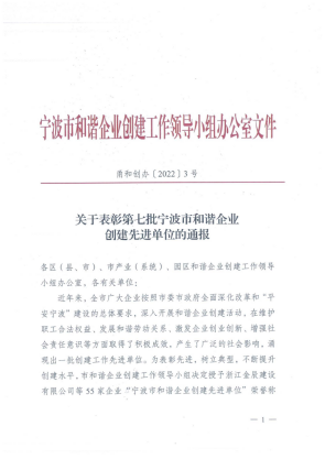 近日,為樹立典型示范,促進我市廣大企業(yè)發(fā)展和諧勞動關(guān)系,增強社會責任意識,提升創(chuàng)建水平,寧波市和諧企業(yè)創(chuàng)建工作領(lǐng)導小組公布“寧波市和諧企業(yè)創(chuàng)建先進單位”評選結(jié)果,表彰在創(chuàng)建工作中表現(xiàn)卓越的先進單位。經(jīng)評定,共授予55家企業(yè)“寧波市和諧企業(yè)創(chuàng)建先進單位”榮譽稱號,我院光榮在列!