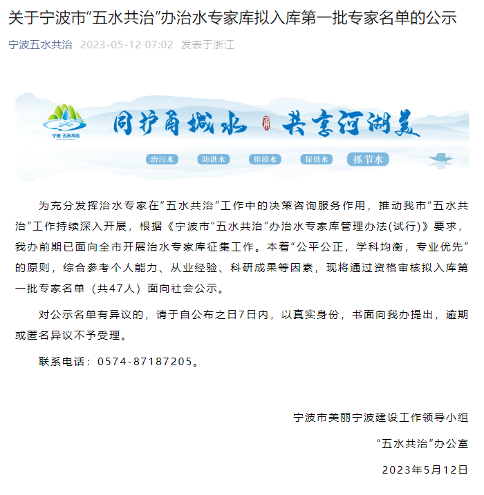 為充分發(fā)揮治水專家在“五水共治”工作中的決策咨詢服務(wù)作用,推動(dòng)我市“五水共治”工作持續(xù)深入開展,根據(jù)《寧波市“五水共治”辦治水專家?guī)旃芾磙k法(試行)》要求,寧波市美麗寧波建設(shè)工作領(lǐng)導(dǎo)小組“五水共治”辦公室前期已面向全市開展治水專家?guī)煺骷ぷ鳌?/span>