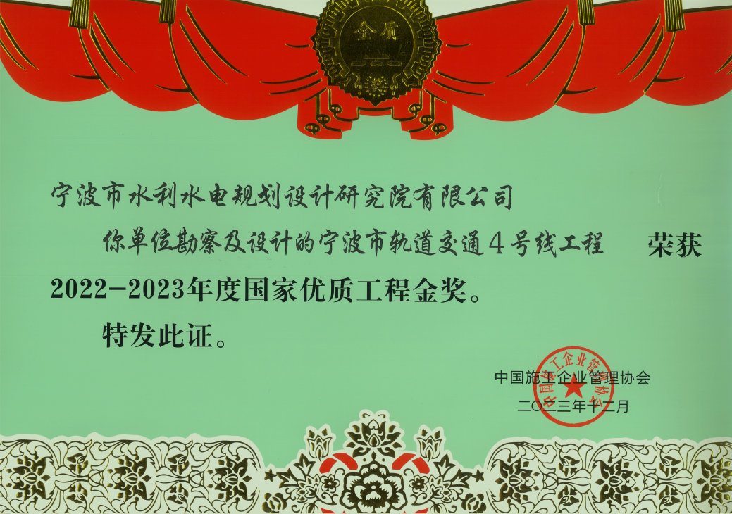 2023年我院多個項目在各類評比中脫穎而出,榮獲中國水利工程優(yōu)質(zhì)(大禹)獎、國家優(yōu)質(zhì)工程金獎、全國優(yōu)秀工程咨詢成果三等獎、浙江省水利科技創(chuàng)新獎、浙江省水土保持學(xué)會第三屆優(yōu)秀設(shè)計三等獎、“浙江省文明標(biāo)化工地”稱號、2023 年度寧波市建設(shè)工程優(yōu)秀勘察設(shè)計獎、2023年度寧波市“甬江建設(shè)杯”優(yōu)質(zhì)工程獎、寧波市水利科技創(chuàng)新獎、寧波市水利學(xué)會優(yōu)秀論文獎等各類榮譽20余項。