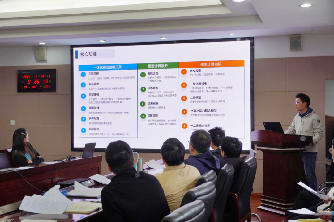 隨后,平臺(tái)研發(fā)團(tuán)隊(duì)代表陳龍贊對(duì)“澤圖水文水動(dòng)力一體化模型平臺(tái)”進(jìn)行詳細(xì)介紹,并進(jìn)行現(xiàn)場(chǎng)實(shí)操演示。該平臺(tái)是一套我院自主研發(fā)的以組件化建模、并行化求解、在線化計(jì)算、一體化耦合、國(guó)產(chǎn)化支持為核心的水文水動(dòng)力模型平臺(tái),能夠滿足包括產(chǎn)匯流計(jì)算、水庫(kù)調(diào)度、一維河網(wǎng)、二維淹沒(méi)、水文水動(dòng)力耦合、一二維水動(dòng)力耦合在內(nèi)的多種模擬需求,適用于獨(dú)立部署、嵌入第三方項(xiàng)目等多種應(yīng)用場(chǎng)景?;诮9ぞ?、模型服務(wù)、計(jì)算核心三分離的設(shè)計(jì)架構(gòu),平臺(tái)具備分布式部署、集群化管理、多節(jié)點(diǎn)負(fù)載均衡的動(dòng)態(tài)能力,滿足靈活適用多種尺度的計(jì)算需要。